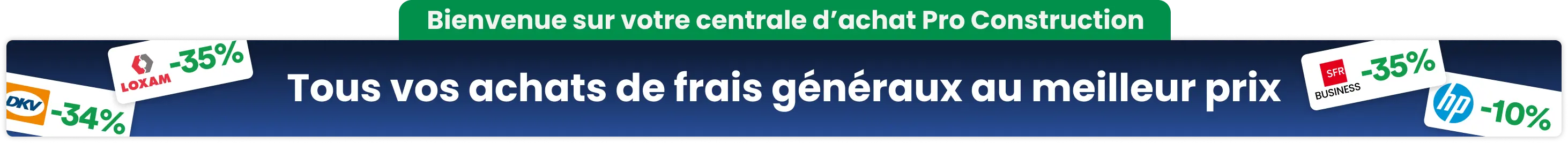 La centrale d'achat Pro Construction vous donne accès à des tarifs déjà négociés auprès de plus de 100 fournisseurs nationaux : photocopieurs, fournitures de bureau, téléphonie, informatique, extincteurs, contrôles réglementaires, véhicules, finance, RH...